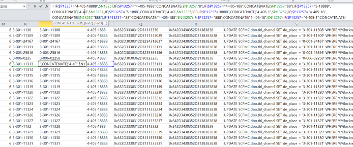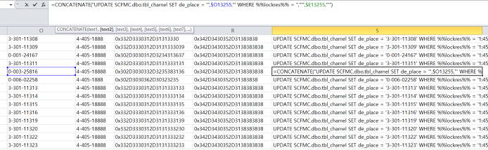 =CONCATENATE("UPDATE SCFMC.dbo.tbl_charnel SET de_place = '",$O13255,"' WHERE %%lockres%% = ","'",$E13255,"'")